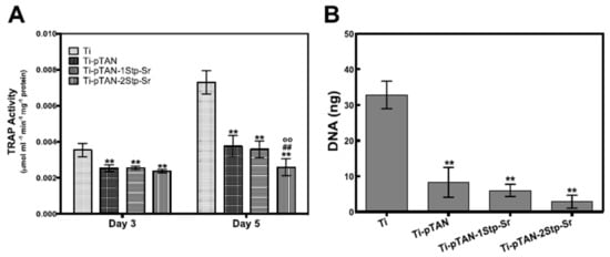 Osteoclast TRAP activity (A) and total DNA; (B) after 5 days of culture on Ti, Ti-pTAN, Ti-pTAN-1Stp-Sr, Ti-pTAN-2Stp-Sr.