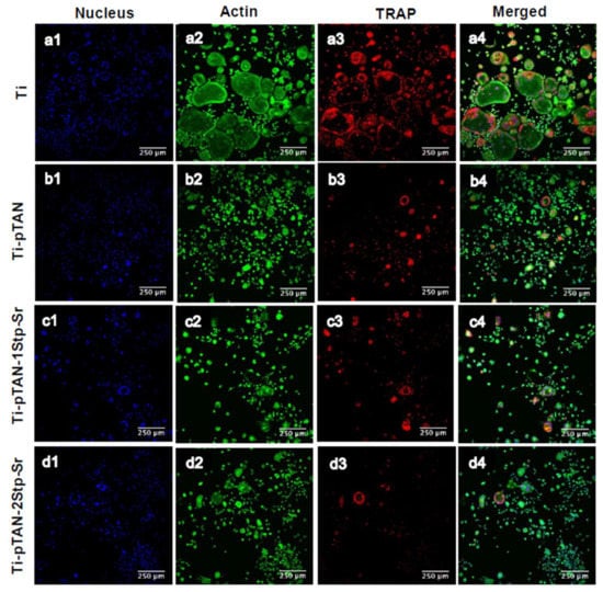 Cells after 5 days of culture on Ti, Ti-pTAN, Ti-pTAN-1Stp-Sr and Ti-pTAN-2Stp-Sr were stained for actin and TRAP (Figure 10). TRAP positive multi-nucleated cells with more than 3 nuclei were considered as osteoclasts. Unlike Ti (Figure 10a1–4), which displayed large multinucleated TRAP positive osteoclasts, smaller and reduced number of multinucleated TRAP positive cells were observed on Ti-pTAN (Figure 9b1–4), Ti-pTAN-1Stp-Sr (Figure 10c1–4) and Ti-pTAN-2Stp-Sr (Figure 10d1–4). Similar to the TRAP activity estimation data of cell culture supernatant, intracellular TRAP production was decreased for cells on Ti-pTAN (Figure 10b3), Ti-pTAN-1Stp-Sr (Figure 9c3) and Ti-pTAN-2Stp-Sr (Figure 9d3) as compared to Ti (Figure 10a3). Cells especially on Ti-pTAN-2Stp-Sr depicted the lowest TRAP production of all the substrates. This suggested that the osteoclast inhibitory effects of Ti-pTAN-2Stp-Sr were superior to both Ti-pTAN-1Stp-Sr and Ti-pTAN.