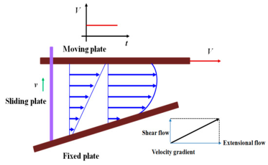As mentioned above, in the actual process of eccentric rotor extrusion, the polymer melts undergo a combination of extensional deformation and shear deformation; see Figure 1.