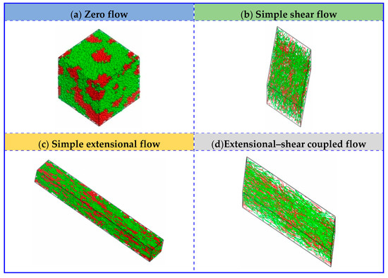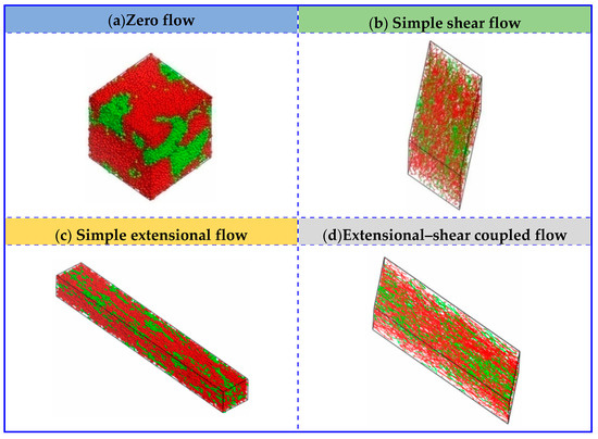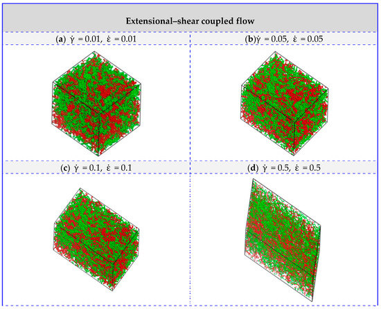 Consequently, in Materials Studio, simple shear flow (), simple extensional flow () and extensional–shear coupled flow () can be described as Equations (11)–(13), respectively, in which the equivalent hydrostatic pressure p is zero.