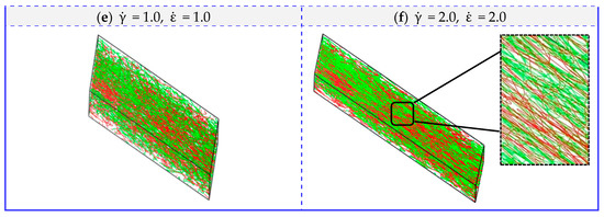 To further investigate the effect of extensional–shear coupled rate on the morphology and distribution in the blended UHMWPE and PA6, a combination of the above simple shear flow and extensional flow was then applied. Figure 4 is a plot of the mesoscopicmorphology of UHMWPE/PA6 blends responding to an extensional–shear coupled flow, with varying levels of shear rates and extensional rates, such as = 0.01–2, and = 0.01–2 (). As seen in Figure 4, the equilibrated morphologies and distributions of the polymers are very different in the range of 0.01–2.0. The micelle-like clusters are noticeable at a low and (from 0.01 to 0.1) because the flow is also not strong enough to disturb the microstructure and the morphology remainsalmost unchanged. With further increasing and , the molecular chains are highly oriented. The distribution of PE and PA molecules are uniform by changing coupled rates, maintaining a good compatibility between PE and PA6. Based on the analysis above, it can be concluded that the coupled rate applied to the UHMWPE/PA6 blends more significantly affect the morphologies than the distribution of the polymers, which should be taken into account in the preparation of UHMWPE/PA6 blends. It is worth noting thatfrom the enlarged view of Figure 2f and Figure 4f, the orientation of UHMWPE and PA chains induced by extensional–shear coupled flow is more obvious than shear flow, which is in accordance withexperimental Raman spectra results in Reference [12].