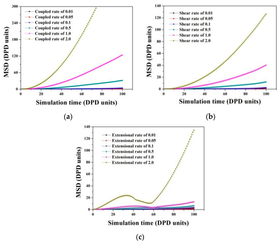 To shed more light onto the morphology and alignment behavior corresponding to extensional–shear coupled flow, we plot the mean square displacement (MSD) of PA6 as a function of simulation time for different coupled rates in Figure 7, as well as shear rates and extensional rates. MSD can be acknowledged as more effective parameter to characterize the average motion velocity of particles compared with the diffusion coefficient and it is calculated by Equation (14) [30,31]: