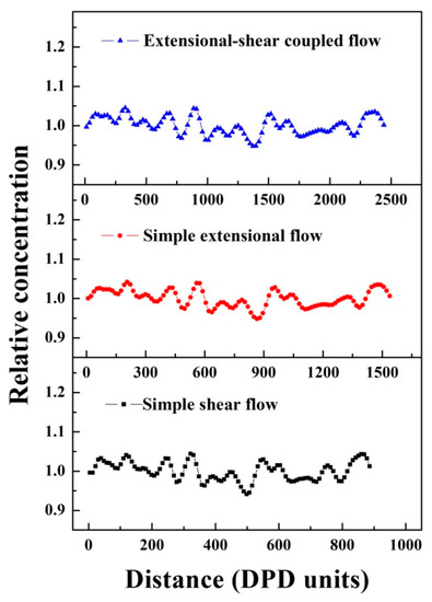 where and refer to the coordinate of a particle at time t and 0, respectively. The slope of the MSD-time curve represents the intensity of activity in polymer chains (or beads). We noticed that the slopes of MSD curve in Figure 7a exhibit slight increases upon increasing coupled rates because increasing coupled rates can enhance the random motion velocity of polymer chains, consequently raising the diffusivity of polymer chains, which provides clear proof that the alignment in UHMWPE/PA6 blends are significantly impacted by extensional–shear coupled rates, similarly in the case of shear flow and extensional flow (see Figure 7b,c). Figure 8 displays the relative concentration distribution of PA6 along Z direction. From the number and magnitude of the peak values, the distribution behavior can be evaluated.The fewer peaks and smaller the peaks values, the more uniform the distribution presents in the blends. An almost similar trend of the number and magnitude of peak values in relative concentration distribution curves is observed by comparingextensional–shear coupled flow, simple shear flow and simple extensional flow. This indicates that flow variations yield less effect on the distribution behaviors, in agreement with previous DPD results.