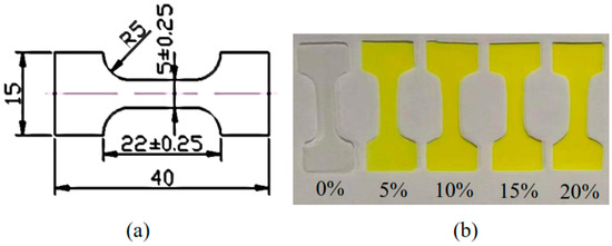 (a) geometric dimension of test samples; (b) the prepared test samples with different phosphor mass fractions.