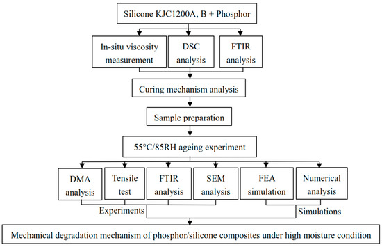 The flowchart of study plan in this paper is shown in Figure 3. Two major parts include the analysis of both curing mechanism and long-term high moisture accelerated mechanical degradation mechanism. In detail, the in situ viscosity monitoring, DSC and FTIR test are used to analyze the curing mechanism of silicone, while the tensile strength, DMA, FTIR, and Scanning Electron Microscope/ Energy Dispersive X-Ray Spectroscopy (SEM/EDS) tests are used to analyze the degradation mechanism of prepared test samples. Furthermore, both FEA simulation and theorical calculation are used in this study to explain the mechanical properties of phosphor/silicone composites.