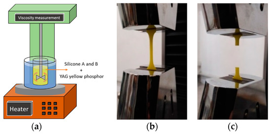 The curing experiment of phosphor/silicone composites comprehensively considers the influence of temperature (65 °C, 80 °C, 95 °C) and phosphor concentration (0%, 5%, 10%) in the curing process. The curing experimental setup is shown in Figure 4a. The viscosities of composites were in situ measured by the viscosity measurement instrument (Model: NDJ-8S, accuracy: ±1%, the rotating speed is set as 30 r.p.m.) during the curing process. The high moisture ageing test condition was designed by considering the similar high temperature and high humidity condition as the summer weather in south China (55 °C/85RH). The prepared test samples were placed in the constant temperature and humidity chamber with 1008 h ageing time. Five test samples per group were picked out for the tensile test, DMA and FTIR characterizations at every 168 h. The tensile test setup with an Electromechanical Universal Testing Machine from the MTS system Co. Ltd. (Shenzhen, China) (Model: CMT4204, accuracy: level 0.5) is shown in Figure 4b,c.
