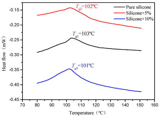 The glass transition temperatures, Tg, of pure silicone and phosphor/silicone composites with mass fractions of 5% and 10% were tested by using the DSC, respectively. As shown in Figure 6, the Tg of both pure silicone and phosphor/silicone composites are extracted around 103 °C. This can be explained by the fact that, as there is large difference of Tg between phosphor and silicone and the addition of phosphor will not break the molecule chain of silicone, the Tg1 of silicone plays a dominant role in the Tg2 and Tg3 of prepared 5% and 10% phosphor/silicone composites. Thus, both pure silicone and phosphor/silicone composites can be cured under the same condition to prepare the test samples.