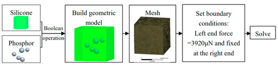 In the FEA modeling and simulation process as shown in Figure 10, the representative volume element model has a size of 70 μm × 70 μm × 70 μm in which the randomly distributed spherical particles represent phosphor powders. The cube model represents the silicone matrix and it adopts the superelastic neo-Hookean constitutive relation. The component models of phosphor particles and silicone are assembled by using the Boolean operations. The phosphor particles are randomly distributed in a unit volume element based on a certain statistical law and it must ensure that there is no overlap that occurs between the particles. The simulation parameters of components at the initial state are shown in Table 2 and the specific simulation process is described in Figure 10. Figure 11 presents the volume element models and transient mechanical simulation results of phosphor/silicone composites with mass fractions of 5%, 10%, 15% and 20%, respectively.