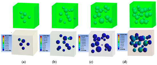 Volume element models and transient mechanical simulation results of phosphor/silicone composites (a) 5%; (b) 10%; (c) 15%; (d) 20%.