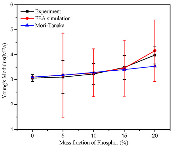By comparison, the transient Young’s modulus of phosphor/silicone composites with mass fraction of 5%, 10%, 15% and 20% were estimated by using both the FEA simulation and the Mori–Tanaka method. The estimated results were compared to the actual tensile testing results. Firstly, the averaged Young’s modulus of ten randomly generated models from each mass fraction group were simulated with the FEA method described in Section 3.2.1. As indicated in Figure 12, it can be found that, as the phosphor mass fraction increases, the averaged Young’s modulus increases gradually, which is consistent with the experimental results. In addition, the Young’s modulus obtained from experiment is relatively lower than that from simulation, which may be due to the fact that the phosphor has a certain degree of precipitation during the composite’s preparation [27]. Secondly, when it compares to the theoretical calculation based on the Mori–Tanaka method, it shows that, when the phosphor mass fraction is small, both the FEA simulation results and Mori–Tanaka calculations are close to experimental results. However, when the phosphor mass fraction increases, the gaps between the FEA simulation results and the Mori–Tanaka calculations become larger. This indicates that the Mori–Tanaka method is suitable to predict the mechanical properties of phosphor/silicone composites with low phosphor contents. This is because, when the phosphor content is increased, the uneven distribution of phosphor powders in the silicone matrix results in the gap between theoretical calculations and experiments.