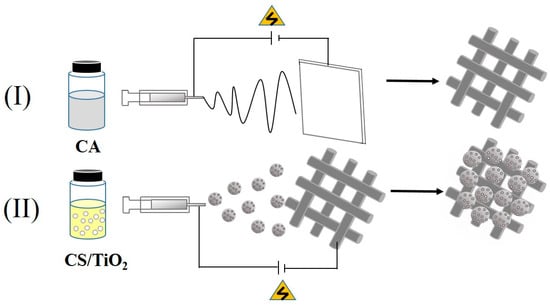 The preparation of C-T/CA fiber membranes: (I) Electrospinning, and (II) electrospraying.