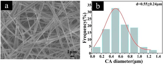 The morphology and diameter distributions of the CA substrate are displayed in Figure 2. The surfaces of the CA fibers were smooth without beads. The mean diameter of CA fibers was 0.55 ± 0.24 μm (shown in Figure 2b).