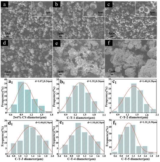 SEM images and diameter distributions of the microspheres. (a) and (a1) 2 wt % CS, (b) and (b1) C-T-1, (c) and (c1) C-T-2, (d) and (d1) C-T-3, (e) and (e1) C-T-4, (f) and (f1) C-T-5.
