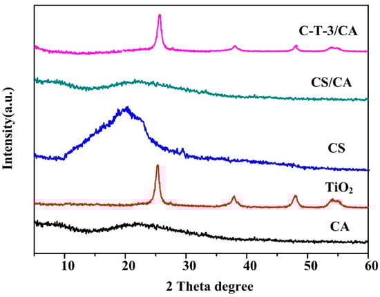 XRD spectra of CA, TiO2, CS powders, CS/CA and C-T-3/CA fiber membranes.