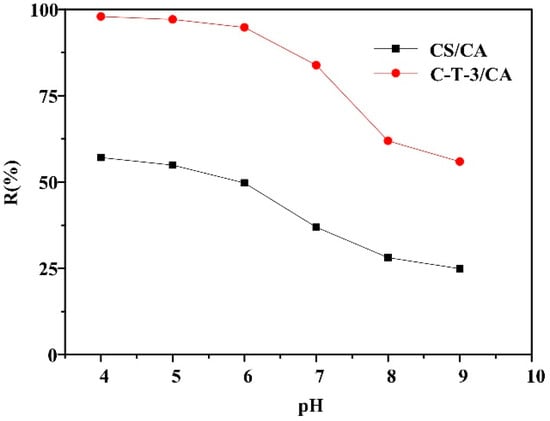 The pH value, as a crucial parameter, controlled the MO removal ability by affecting the degree of ionization of hydrogen ions, hydroxide ions in solutions and structural stability. Figure 7 shows the removal amount of MO in the pH value range from 4 to 9 under UV light. Both samples exhibited high removal amount with pH value in the range of 4–6, and MO removal amount gradually declined as the pH value increased. C-T-3/CA had a higher removal amount than CS/CA due to both adsorption and photocatalysis for C-T-3/CA. The removal amount was greatly improved by the addition of TiO2 (that allowed for simultaneous adsorption and photocatalysis) under acidic conditions. This was because under acidic conditions, the –NH2 on the CS molecule was protonated, and TiO2 existed in the form of TiOH2+, resulting in the electrostatic attraction among—SO3− in MO, –NH3+ and TiOH2+ [,]. Under alkaline conditions, the –NH2 on the CS molecule was deprotonated, TiO2 generated the TiO−, and an electrostatic repulsion appeared between fibrous membranes and MO, which resulted in the decrease of removal amount []. The maximum removal amount of MO for both samples was obtained at pH = 4.