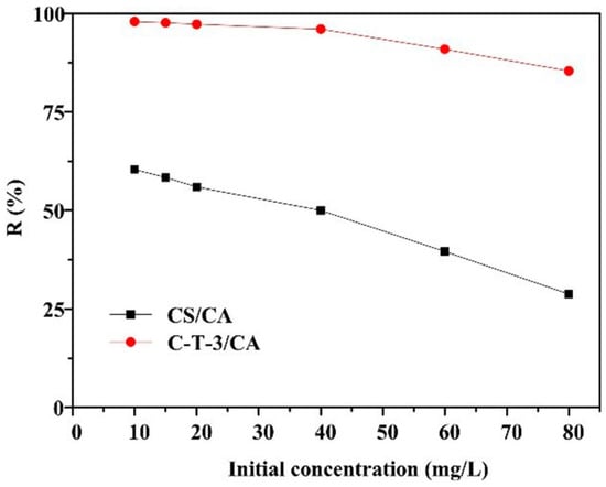 The effect of initial MO concentration on MO removal is indicated in Figure 8. The MO removal ratio of CS/CA and C-T-3/CA decreased with the increase of the initial concentration of MO. At a lower initial concentration of MO, fiber membranes CS/CA and C-T-3/CA provided sufficient reactive sites for removal of MO. With the increase of initial concentration of MO, the total amount of MO molecules increased. However, the amount of fiber membranes remained unchanged, meaning that the amount of reactive sites did not change. Therefore, the removal ratio of MO decreased at the higher initial concentration of MO. C-T-3/CA showed a higher removal ratio of 98.4% than CS/CA at initial concentration of 10 mg/L due to simultaneous adsorption and photocatalysis for the MO removal by C-T-3/CA.