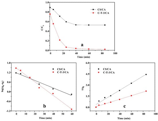 The effect of time on the removal capacity of MO by CS/CA and C-T-3/CA are shown in Figure 9a. As time increased, the removal amount of MO by CS/CA and C-T-3/CA increased and then gradually reached the equilibrium state. In the initial stage (t < 25 min), due to the large number of active sites in both adsorbents, the removal amount of MO increased rapidly with the increase of contact time. The removal amount of MO increased slowly and finally reached the equilibrium 25 min later []. For CS/CA, the adsorption equilibrium appeared at 40 min, while for C-T-3/CA, equilibrium was reached at 60 min. Due to the addition of TiO2 nanoparticles, which increased the specific surface area of the fiber membrane, more time was token for the MO to penetrate the fiber membranes. Therefore, the contact time of 60 min was used for subsequent tests to ensure sufficient adsorption and photocatalytic degradation treatment. The pseudo-first-order and pseudo-second-order kinetic models were used to study the behavior of MO removal of fiber membranes [], which can be expressed as follows: