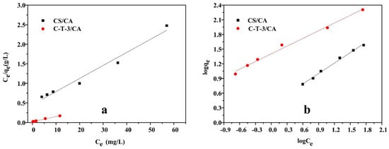 The experimental isotherm curves of MO removal are shown in Figure 10a,b. The relevant isotherm parameters calculated from the curves are listed in Table 3. On the basis of the correlation coefficients of MO removal by CS/CA, the Freundlich isotherm model (Figure 9b) was better fitted than the Langmuir isotherm model (Figure 9a). Therefore, the CS/CA mainly exhibited multiple layers of adsorption. After the addition of TiO2, the correlation coefficients of the Langmuir model and Freundlich model were approximately equal, indicating that C-T-3/CA exhibited multiadsorption behavior. This might be due to both the effects of photocatalytic degradation and adsorption [].