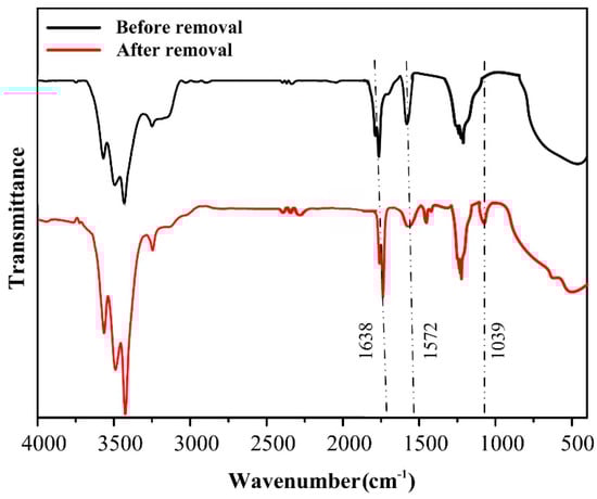 FTIR spectra of C-T-3/CA before and after MO removal.