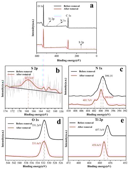 As shown in Figure 12, XPS was employed to analyze the chemical element of the membrane surface before and after the removal (that allowed for coinstantaneous adsorption and photocatalysis) of MO with full-range and magnified spectra of S, N, O and Ti. It can be seen in Figure 12a that C-T-3/CA membranes before MO removal showed peaks of binding energy at 285.5, 397.7, 531.2 and 457.1 eV, which were assigned to carbon atom (C 1s), oxygen atom (O 1s), nitrogen atom (N 1s) and titanium atom (Ti 2p), respectively. As seen in Figure 12b, the peak of S 2p appeared at 167.7 eV after removal of MO, indicating MO adsorbed on the surface fiber membranes. For the N 1s spectrum in Figure 12c, the peak at 399.1 eV was assigned to –NH2 group before MO removal. After MO removal, a new peak appeared at 401.7 eV and was attributed to –NH3+, and the peak of –NH2 at 399.1 eV shifted to 399.8 eV. This indicated that –NH2 was protonated as –NH3+, and electron transfer occurred between –NH2 and MO molecules, respectively []. As seen in Figure 12d,e, the O 1s and Ti 2p binding energy increased after the removal of MO. Ti could exist in the form of TiOH2+ in acid solutions. After the reaction with MO molecules, the groups of –OH2+ as electron acceptors could interact with –SO3− of MO due to electrostatic attraction, which could influence charge density of Ti and O [].