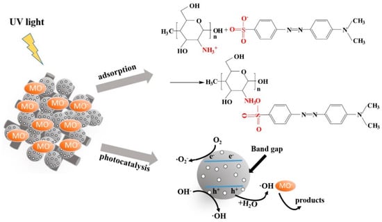 According to the above analysis, the high removal capacity of C-T-3/CA was mainly due to the effective dispersion of TiO2 in combination with CS, which improved the specific surface area of fiber membranes and increased the sites of photocatalytic degradation and adsorption. MO molecules could be adsorbed to the vicinity of photodegradation sites by electrostatic attraction between CS and MO molecules, promoting the contact probability of TiO2 and MO in the following photocatalytic degradation process. The reaction mechanism between MO and C-T-3/CA is illustrated in Figure 13. The mechanism of photocatalysis is summarized from Equation (7) to Equation (12). The MO removal mechanism included: (1) Adsorption, the electrostatic attraction between –NH3+ group of CS and –SO3− of MO molecules; (2) photocatalysis, the photocatalytic degradation of the MO by UV illumination began with photoexcitation of the TiO2 and then formed an electron-hole pair (Equation (7)). High oxidation valence-band holes (h+) directly oxidized MO degradation (Equation (8)). Water decomposition produced ·OH (Equation (9)) or a reaction of h+ with OH− (Equation (10)). Meanwhile, the reaction between conduction-band electrons (e−) and proper electron acceptors (such as O2) yielded oxidative radicals as described by Equation (11). The generated hydroxyl radicals easily degraded MO to form inorganic small molecules (Equation (12)) []. These results agreed with BET, FTIR and XPS analyses.