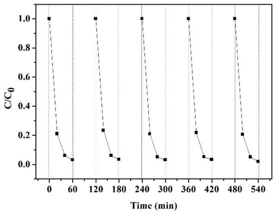 To research the recycling ability of the composite membranes, the absorbance changes were measured in five cycles of MO removal. As demonstrated in Figure 14, the MO removal of fiber membranes was almost invariable for five consecutive cycles. The membranes still had a removal ratio of 98% at the end of the fifth cycle, testifying that the membranes maintained good performance of adsorption and photocatalytic degradation. This was because the stability of CS in aqueous solutions was improved by the intermolecular hydrogen bonds between CS and CA, and TiO2 could be uniformly distributed via the interactions with CS molecules for effective photocatalytic degradation of MO [].