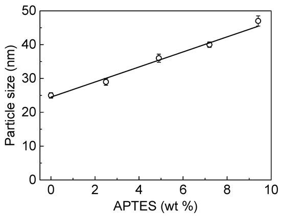 The particle sizes of DSPDs varied from 25 to 47 nm depending on the APTES content (see Figure 1). This result is in good agreement with the results reported by Sardon et al. [23]. These authors reported that a small amount of amine silane does not affect the size of the dispersed particles until it exceeds 14 wt.%. For more than 14% amine silane content, an inorganic-rich domain begins to appear on the particle surface, increasing particle size. Considering the total content of amine silane in our system (which is less than 10 wt.% of solid content), the particle size increase by silane addition should be interpreted as being due to urea linkage formation. This phenomenon is because urea linkages that are formed by the reaction of isocyanate and amine silane are less hydrophilic than the urethane linkage.