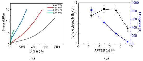 Figure 3a,b show stress–strain curves and tensile strengths and elongations of DSPD films with different amounts of APTES. The elongation at break decreased monotonically with APTES content while tensile strengths increased until 7.20 wt.% of APTES and decreased at 9.41 wt.% of APTES (Figure 3b). Although the film with the APTES content of 9.41 wt.% had the highest gel fraction value, it showed low tensile strength with small elongation. For 9.41 wt.% APTES containing films, the polymer chains between the siloxane bonds are easily disentangled with low strain due to their short chain lengths and begin to endure external stress even at small deformation. Polymer chains are mainly composed of soft PTMG and IPDI, and therefore, they were easily broken at low stress levels.