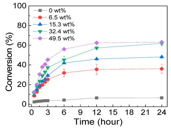 The MPO decompositions by the composite films were determined using the method of Katz et al. [3]. UV-Vis spectroscopy was used for monitoring the nitrophenolate ions. As the reaction time increased, the peak at 407 nm indicating nitrophenolate formation increased (see Figure S3). The conversion profile for the MPO to nitrophenolate was calculated using the absorbance of the nitrophenolate peak. Figure 7 shows that MPO decomposition increased with increasing UiO-66 content and reaction time. After 6 h reaction, the MPO conversion rates of all composite films decreased, and MPO conversion at 24 h was estimated to be approximately 36.0–63.2% depending on the UiO-66 content. The decrease in the MPO conversion rate with reaction time is due to the activity degradation of UiO-66 by the high pH of the test solution (pH = 12). It is well-known that UiO-66 loses its activity in basic solutions [26,27]. In this study, UiO-66 particles were degraded by co-catalyst (N-EM) (see Figure S2). However, UiO-66 particles dispersed in a polymer film were less influenced by N-EM than UiO-66 slurry considering our previous results [24]. Based on the SEM images showing the porous surface and voids of the 49.5 wt.% UiO-66 dispersed film (Figure 5), the test solution can easily diffuse into the film and is decomposed rapidly at the early reaction time, but it gradually degrades the activity of UiO-66.