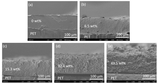 Cross-section SEM images of the UiO-66/DSPD composite films with (a) 0, (b) 6.5, (c) 15.3, (d) 32.4, and (e) 49.5 wt.% UiO-66 contents on polyethylene (PET) substrates.