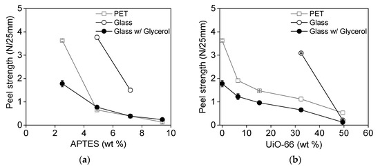 (a) Peel strengths of DSPD films with different amounts of silane and (b) DSPD composite films with different amounts of UiO-66 (b) on the PET or glass substrate. The silane content of composite films is 2.5 wt.%.