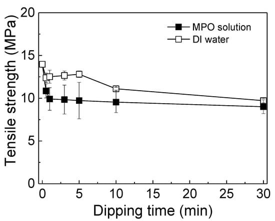 Tensile strengths of the UiO-66/DSPD composite films as a function of dipping time. The composite film had the UiO-66 content of 15.3 wt.%, and tensile tests were performed 3 h after dipping.