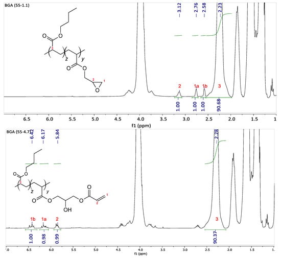 The amount of comonomer measured by NMR corresponds to the feed value, as the polymerization conversion reaches nearly 100%. After post-modification, the number of acryloyl functions is measured by NMR. As depicted in Figure 1 for the backbone BGA(55-1.1), the glycidyl functions in the backbone appearing between 2.6 and 3.2 ppm are completely converted to acryloyl functions between 5.8 and 6.4 ppm. All of these polymers are fully soluble in toluene, indicating that no cross-linking occurred in the backbone polymerization step or during its modification.