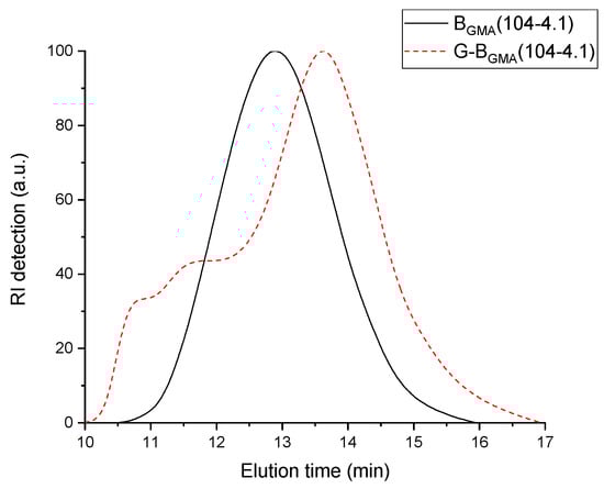 Comparing G-BGMA(26-3.5) with G-BGMA(52-4) shows a decrease of the non-soluble fraction from 50 wt.% to 17 wt.% by doubling the number of monomer moieties between adjacent reactive group Nm. A similar observation is made by comparing G-BGMA(50-16.7) with G-BGMA(52-4)—the non-soluble fraction is significantly reduced from 73% to 17% when the amount of reactive groups is lowered from 16.7 to 4. At the same time, the backbone length is kept constant at about 50 kg/mol. The backbones with high numbers of reactive sites on short backbones (G-BGMA(35-22) and G-BGMA(50-16.7)) even lead to highly insoluble products with non-soluble fractions higher than 70 wt.%. This is due to the high reactivity of acryloyl groups. Sample G-BGMA(104-4.1) without any cross-linked particles has Mn around 52 kg/mol. This value is significantly lower than the molecular weight of its backbone with Mn around 104 kg/mol. The corresponding RI signal of the SEC elugram shown in Figure 2 is separated in two areas: one area at low elution volume and another one at high elution volume. Obviously, a fraction of the blend has lower molecular weight than the backbone (higher elution time) and the other fraction has higher molecular weight (lower elution time). The lower molecular weight corresponds to homo-PS formed during the synthesis and the higher molecular weight is attributed to the graft copolymer. This explains why the number-average molecular weight Mn of the blend is lower than the molecular weight of the backbone used. Furthermore, the dispersity of the blend is between 4.2 and 5.2. This value of dispersity above 4.0 is obviously due to the broad peak (homo-PS + copolymer), as observed in Figure 2.