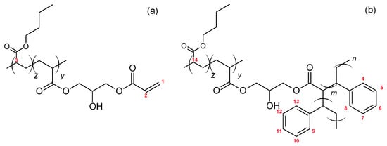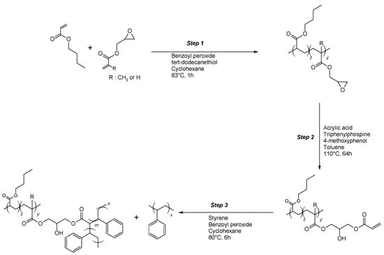 Table 2 provides evidence for the quantitative formation of post-modified backbones, as the number of acryloyl groups per chain is equal to the number of glycidyl groups. It is worth mentioning that the molecular weight is unchanged before and after the modification of the backbone and that all of the modified backbones are completely soluble in toluene. This means that degradation in molecular weight and cross-linking during post-modification could be avoided. All of the modified backbones are copolymerized with styrene, as described in the next section.