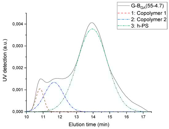 The elugram of G-BGMA(55-4.7) blend is shown in Figure 5 (black curve). UV detection is used, as polystyrene is UV active while PBA is not. The elugram consists of two zones: one between 11 and 13 min corresponding to high molecular weight graft copolymer, and another one between 13 and 17 min corresponding to homo-PS. The deconvolution method is used to mathematically separate overlapping peaks. It appears from the fitting performed on the sample G-BGMA(52-4) that the peak assigned to graft copolymers is further split into two separate peaks, as reported for PB-g-PS/PS blends previously by Huang et al. [27].