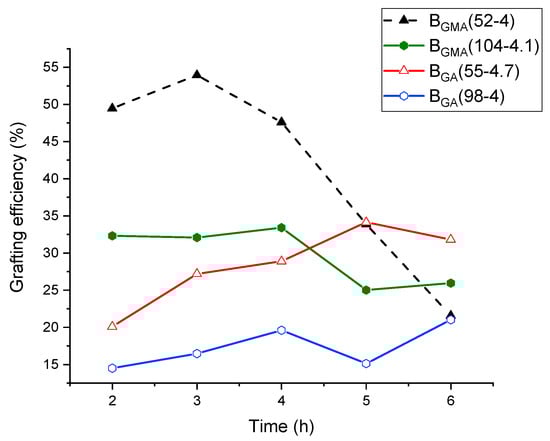 Moreover, it is observed that the grafting efficiency at 1 h is lower in the case of the GA-based backbone compared to the GMA-based one. However, during the polymerization, the grafting efficiency decreases with the GMA-based backbone and increases with the GA-based backbone and the curves cross or converge after 6 h of reaction. This is the case between BGMA(52-4) and BGA(55-4.7) and between BGMA(104-4.1) and BGA(98-4).