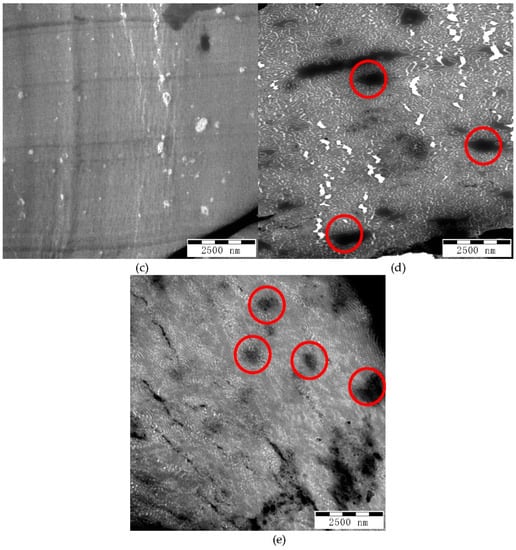 TEM images with smaller magnification at 10,000× are shown in Figure 8. The micrographs shown in Figure 8a–c have dark lines or zones corresponding to thick portion of the film due to cutting. Figure 8d shows a white area due to breaking of the film during cutting. However, the micrographs of G-BGA(98-4) and G-BGA(98-9.8) reveal dark spots different from those that represent larger domains of PS (circled in Figure 8d,e). The size of these PS domains are in the range of 0.5 to 2 μm. This explains the high haze (above 60%) and low clarity (below 20%), since light is diffracted and scattered. In contrast, there are no large dark regions visible in the micrographs of the samples G-BGMA(52-4) and G-BGA(55-4.7), correlating well with the lower haze (below 25%) and higher clarity (above 90%). G-BGMA(104-4.1) has higher haze and lower clarity compared to G-BGMA(52-4) and G-BGA(55-4.7). However, no large PS domains are detected in Figure 8b.