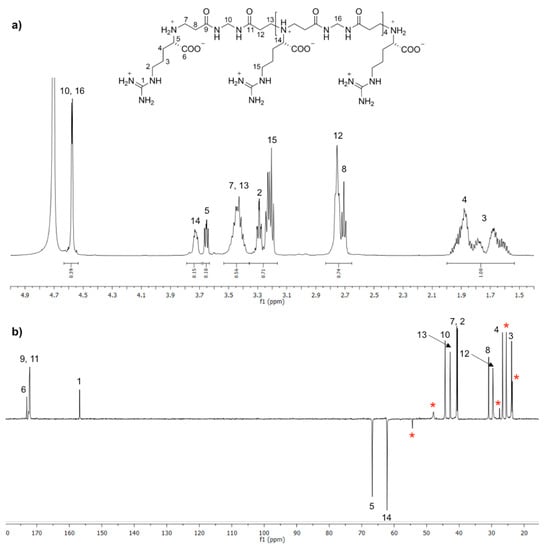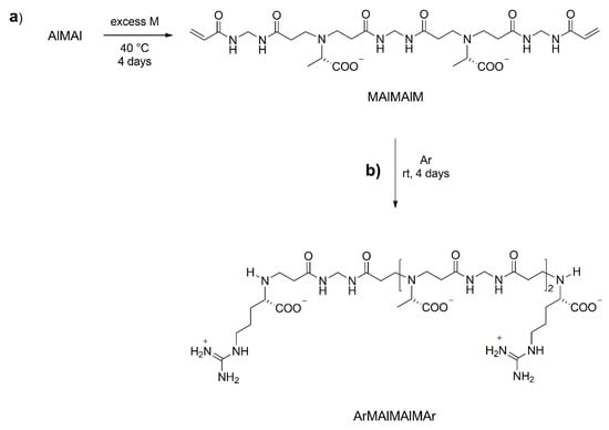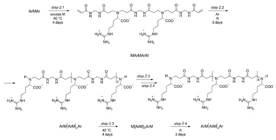 The controlled synthesis of the PAAC called l-ARGO7 [12,13], and of its copolymers with l-alanine as a model for other amino acids, has provided the proof of principle of the new process. l-ARGO7 and its d- and d, l-stereoisomers with broad polydispersity had been previously prepared by polyaddition of l-arginine (henceforth called Ar) with N,N′-methylenebisacrylamide (henceforth called M). l-ARGO7, which is the first PAAC ever reported in the literature, is nontoxic and easily internalized in cells [12]. The first step of the controlled synthesis of l-ARGO7 was preparing the ArMAr trimer or the MArM trimer.
