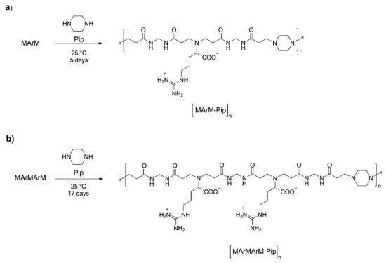All α, ω-M-terminated intermediates from MArM upwards are, in fact, bisacrylamides. As such, they react with prim-monoamines and sec-bisamines to give linear copolymeric PAACs or PAAC/PAA copolymers with controlled amido-α-aminoacid/amidoamine sequences. As a proof of principle, the polyadditions of MArM and MArMArM with equimolecular amounts of piperazine were performed in water at room temperature, obtaining regularly sequenced copolymers with [MArM-Pip]n (Scheme 4a) and [MArMArM-Pip]n (Scheme 4b) structures. Both copolymers were isolated by freeze-drying after a single ultrafiltration step through a membrane with a molecular weight cut-off of 3000.
