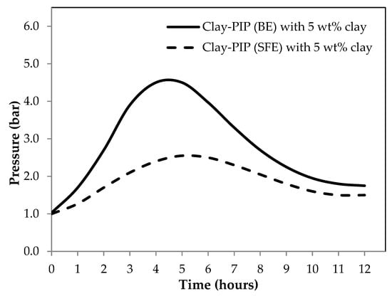 Real-time monitoring data of the internal reactor pressure as a function of reaction time of synthesizing Clay-PIP latexes through batch (BE) and starve-fed (SFE) emulsion polymerization techniques. The organo-nanoclay at 5 wt% relative to the monomer content was employed.