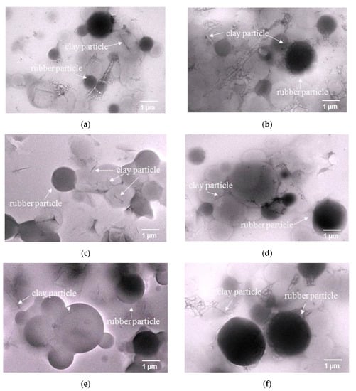 It is obvious from the different product conversions that the particle concentration during emulsion polymerization significantly influences the final properties of the latexes. To confirm this elucidation, a TEM technique was employed to visualize the actual polymer particles and the nanoclay particles distributed in the colloidal latexes. Figure 4 clearly shows that the synthesis technique and the nanoclay content play a role on the morphology of polymer particles. The TEM images of the latexes synthesized with the SFE technique (Figure 4a–e), show that there are nanoclay particles inserted into and/or attached onto the PIP particles, while the BE system (Figure 4f) gives polymer particles with the nanoclay attached onto them, often known as “nanoclay-armored particles” [45].