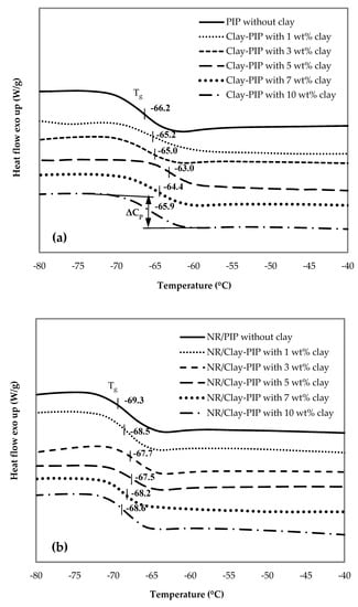 DSC thermograms of the (a) Clay-PIP and (b) NR/Clay-PIP composites containing various nanoclay contents. The Clay-PIP latexes were prepared using SFE technique. The clay contents are relative to the monomer amount.