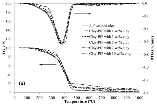 Thermogravimetric analysis was carried out over the temperature range 30 to 1000 °C. Approximately 5 mg of sample was heated at a rate of 10 °C/min under nitrogen to evaluate the effect of nanoclay content on thermal stability of the nanoclay-modified PIP.