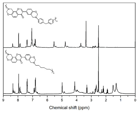 NMR spectroscopy was used to characterize the chemical structures of main-chain-type benzoxazines obtained in this study (see Figure 1 for the 1H NMR spectra of benzoxazines). The characteristic signals attributed to the benzoxazine structure, Ar–CH2–N– and –O–CH2–N– for poly(Dd-ddm)main and poly(Dd-hda)main were found at around 4.76 and 5.54 ppm and 4.13 and 4.99 ppm, respectively. Furthermore, the 1H NMR spectra confirmed the presence of a methylene group corresponding to the CH2 between the benzene rings in ddm for poly(Dd-ddm)main at 3.71. In addition, the typical resonances for the protons in double bond =CH2 from daidzein for poly(Dd-ddm)main and poly(Dd-hda)main were observed at 7.95 ppm and 7.97 ppm, respectively. Moreover, the degree of ring closure was around 72% and 77% for poly(Dd-ddm)main and poly(Dd-hda)main, respectively, as determined from the integral ratio of the resonances for the ring-opened methylene units and the oxazine methylene units. The ring-opened structures in the main-chain-type benzoxazines could not contribute to the ring-opening polymerization, but the phenolic groups in these structures could promote the polymerization process through the catalytic effect.