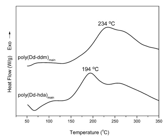 Differential scanning calorimetry (DSC) thermograms of poly(Dd-ddm)main and poly(Dd-hda)main.
