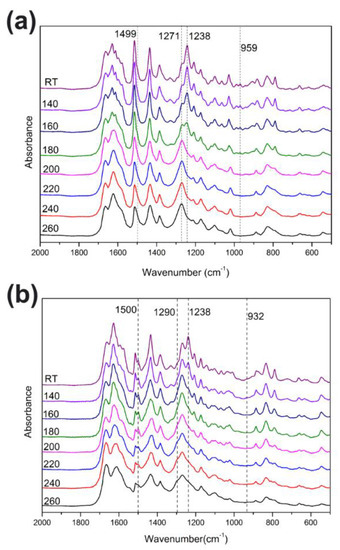 FT-IR spectra of poly(Dd-ddm)main (a) and poly(Dd-hda)main (b) obtained after various thermal treatments.