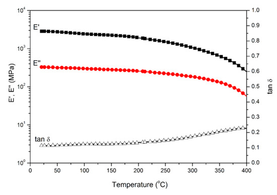 Polybenzoxazine thermosets were obtained after the thermally activated polymerization of main-chain-type benzoxazines. We performed DMA to study the thermomechanical properties of both polybenzoxazines derived from daidzein. Figure 4 and Figure 5 present the DMA profiles of poly(Dd-hda)Xmain and poly(Dd-ddm)Xmain, respectively. As shown in Figure 4, the value of Tg for poly(Dd-hda)Xmain, determined as the peak temperature from the tan δ curve, was as high as 331 °C. However, poly(Dd-ddm)Xmain exhibited no Tg before 400 °C, as seen in Figure 5, indicating that this polymeric material could be applied at a very high temperature. The values of Tg of both polybenzoxazines were much higher than those for other reported thermosets derived from main-chain-type benzoxazines [30,31,32]. In addition, the initial values of storage modulus (E’) and modulus loss (E’’) at 25 °C of poly(Dd-hda)Xmain and poly(Dd-ddm)Xmain were found as 2360 and 283 MPa and 2858 and 326 MPa, respectively, suggesting the relatively higher rigidity of poly(Dd-ddm)Xmain.