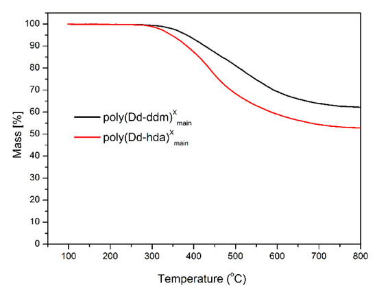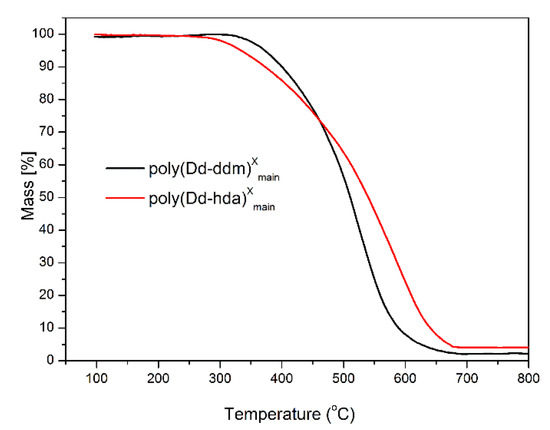 Thermogravimetric analysis of poly(Dd-hda)Xmain and poly(Dd-ddm)Xmain under N2.