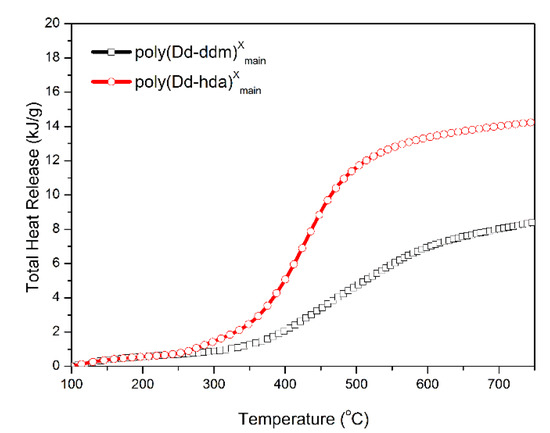 Finally, MCC was carried out to quantitatively evaluate the flammability of polybenzoxazines, including the heat release capacity (HRC) and total heat release (THR). HRC is recognized as an effective standard for evaluating the thermal combustion and a powerful predictor for the flammability of any given materials [33]. Figure 8 and Figure 9 show the graphics of HRR and THR as a function of the temperature, respectively. The MCC analysis allowed the calculation of the HRC values of poly(Dd-hda)Xmain and poly(Dd-ddm)Xmain, which were found to be 83.2 and 27.1 J g−1K−1, respectively, while the corresponding THR values were calculated as 14.3 and 8.4 kJ g−1, respectively. Poly(Dd-ddm)Xmain showed much lower flammability than poly(Dd-hda)Xmain, which is due to their structural difference. Poly(Dd-ddm)Xmain was synthesized from the aromatic diamine while poly(Dd-hda)Xmain was derived from the aliphatic diamine. In general, the aromatic polymers possess much higher thermal stability than aliphatic polymers since aromatic structures are easy to carbonize rather than simply decompose at the elevated temperature. Therefore, poly(Dd-hda)Xmain yields highly carbonized structures during heating, resulting in both lower HRC and THR values. Notably, the HRC value of poly(Dd-ddm)Xmain was much lower than those of polybenzoxazines obtained via polymerization of ortho-amide- or ortho-imide-functionalized benzoxazine resins [15,34]. Since materials with HRC values lower than 300 J g−1K−1 are generally regarded as self-extinguishing, whereas those with HRC below 100 J g−1K−1 are recognized as non-ignitable [35], both polybenzoxazines newly obtained in this study are non-ignitable polymeric materials.